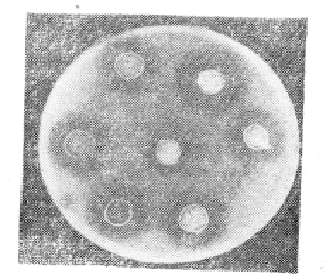 Для обнаружения дезоксирибонуклеазы 1 петлю суточной агаровой культуры лококка засевали «бляшкой» занную среду. На одну чашку различных штаммов. Посевы мостате при 37° 24 часа, затем в таком количестве, чтобы кислота покрыла всю поверхность среды. Через 5—10 мин. кислоту удаляли и производили учет результатов. Если культура обладала способностью выделять в среду дезоксирибонуклеазу, вокруг «бляшек» образовывалась прозрачная зона, состоящая из продуктов деполимеризации ДНК, не осаждаемых 1 н. НС1. Вся остальная поверхность среды покрывалась мутным преципитатом из осажденной соляной кислотой ДНК (рис. 1).