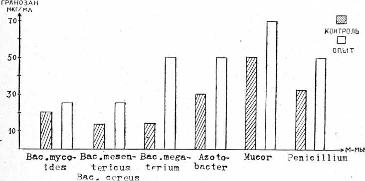 В почвах, содержащих гранозан, появляются устойчивые к нему формы микроорганизмов. Они выдерживают большие дозы пестицида, чем эти же виды микроорганизмов, выделенные из контрольной почвы (см. рис.). Например, споровые бактерии, изолированные из почвы без гранозана, развиваются при концентрации препарата 14—20 мкг/мл, тогда как опытные варианты этих культур дают рост в присутствии 25—50 мкг/мл гранозана в питательной среде. Как видно из рисунка, наиболее чувствительными к гранозану оказались споровые палочки — типичные аммонификаторы почвы.