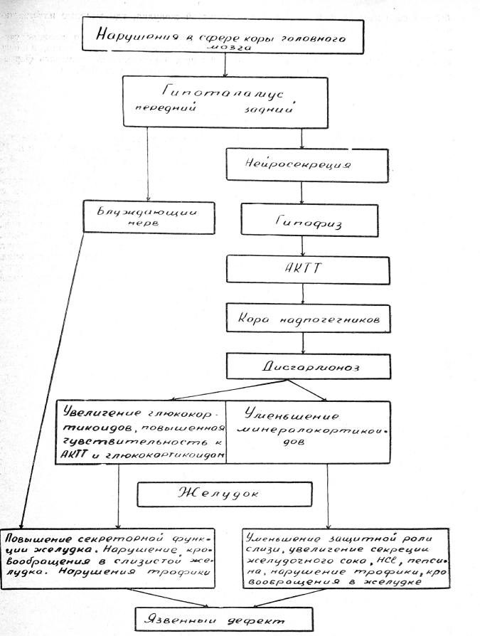 Схему патогенеза язвенной болезни можно представить в настоящее время в следующем виде: при нарушении нормальных взаимоотношений между корой и подкоркой (независимо от места развития первичного поражения) под влиянием центрально возникающих импульсов развиваются изменения функции гипоталамуса, являющегося тем центром, где смыкаются как нервный, так и нервно-гуморальный пути патогенеза язвенной болезни. Возникающая центрально импульсация стимулирует через передний гипоталамус парасимпатикотонию. Это обусловливает повышение секреторной функции желудка, расстройство кровоснабжения слизистой желудка, трофические нарушения, следствием чего является образование язвенного дефекта. Одновременно центрогенная импульсация через гипоталамус [задний гипоталамус — нейросекреция (А. А. Войткевич, 1961, и др.)] вызывает повышение секреции АКТГ гипофизом, увеличение секреции глюкокортикоидов, развитие и усиление дисгормоноза коры надпочечников (снижение минералкортикоидов, преобладание глюко- над минералкортикоидами) с последующим повышением секреторной функции желудка, развитием трофических нарушений, уменьшением защитной роли слизи и пр., и как следствие — развитием язвенного дефекта. Так оба пути патогенеза язвенной болезни смыкаются в конечном пункте — слизистой желудка, где местные патогенетические механизмы и реализуют развитие язвы.