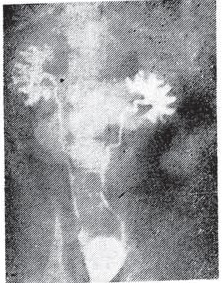 Функциональное состояние мочевыводящих путей мы оценивали по данным экскреторной урографии. На рентгенограммах определялась нормальная функция почек, отсутствовало расширение их полостной системы. На оперированной стороне контрастное вещество равномерно заполняет нерасширенный кишечный трансплантат на протяжении всего замещенного мочеточника. На 15-й минуте контрастное вещество полностью выводится из чашечек и лоханок. Это указывает на хорошее функциональное состояние почки и перистальтику мочевыводящей трубки (см. рис.).
