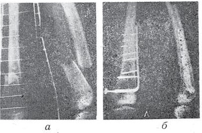 Рис. 2. Рентгенограммы больного Л., 22 лет, до (а) и после (б) остеосинтеза по поводу надмыщелкового перелома.