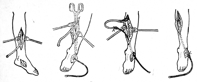 Over the past 7 years, our department has been using a peculiar technique of tendon transplantation. A normal rubber tube serves as a guide for the tendon, the diameter of which depends on the thickness of the tendon and the size of the piece of bone.