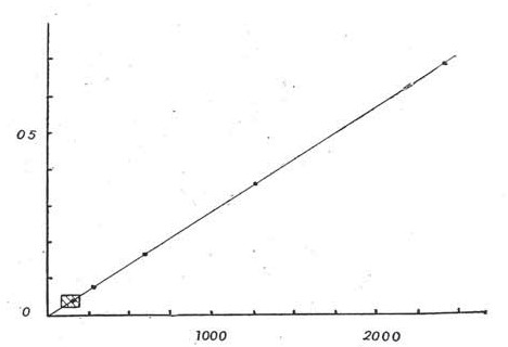 Калибровочная кривая для определения циркулирующих иммунных комплексов. По оси ординат — показатель экстинции в единицах оптической плотности; по оси абсцисс — агрегированный гамма-глобулин (в мкг/мл).