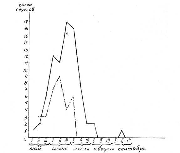 Первые случаи заболевания ВЛКЭ в 1957 г. начали регистрироваться в первой декаде мая, последние — во второй декаде сентября. Максимальное число заболеваний приходится на последнюю декаду июня, первую декаду июля, что наглядно видно из приводимой ниже кривой подекадной заболеваемости ВЛКЭ за 1956—1957 гг.