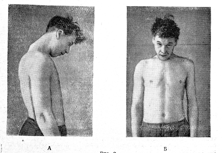 Остаточные нарушения после весенне-летнего клещевого энцефалита у больного К. Вялый верхний парапарез, паралич и атрофия мышц шеи. (Вид спереди и сбоку)