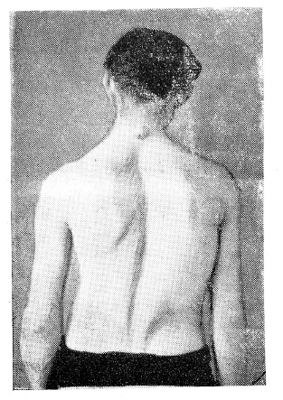 Остаточные нарушения после весенне-летнего клещевого энцефалита у больного X. Парез и атрофия мускулатуры шеи, плечевого пояса, груди, спины слева, искривление грудною отдела позвоночника.