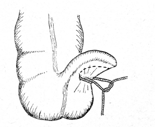Предлагаемый нами метод лигирования сосудов заключается в следующем. Прокол брыжейки червеобразного отростка иглой Дешана (см. рис.) производят в двух местах: первый — у основания отростка, второй — между основанием отростка и свободным краем брыжейки. После отсечения брыжейки от отростка, когда разрез ведут от его верхушки до места первого прокола, второй прокол, фиксируя лигатуру, предотвращает возможность ее соскальзывания.
