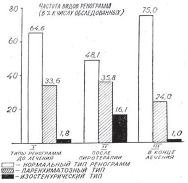 Функцию почек исследовали с помощью комплекса методик, включая радиоизотопную ренографию с гиппураном 131 I (одновременно определяли эффективный почеч^ ный кровоток), общий клинический анализ мочи, пробы Зимницкого, Амбурже. Все исследования проводили при поступлении больных в клинику, после курса пиротерапип и в конце всего лечения.
