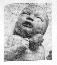 Девочка доставлена 18/ѴIII 1966 г. через 32 часа после рождения. Развита удовлетворительно, подвижна, крик громкий. Вес — 2900 г, длина — 49 см. Видимые слизистые оболочки и кожные покровы цианотичны. При плаче синюшность усиливается. Сердце расположено вне грудной клетки и не имеет сердечной сорочки (рис. 1). Предсердия и желудочки отчетливо выражены, оба ушка отходят в стороны; хорошо различимы коронарные сосуды. Крупные сосуды проникают в средостение через дефект в области тела грудины размером 2,8x3 см. Кожа по краям дефекта мацерирована. У основания сердца и на крупных сосудах имеется фибринозный налет беловатожелтого цвета. Пульсация энергичная, 120 в мин. Четко определяются фазы работы сердца. При каждом вдохе ребенка сердце несколько втягивается в грудную клетку. Число дыхательных экскурсий 28 в мин. Дыхание везикулярное. Живот увеличен в объеме, при пальпации мягкий. На рентгенограмме легочная ткань воздушная, тень сердца располагается впереди грудины.