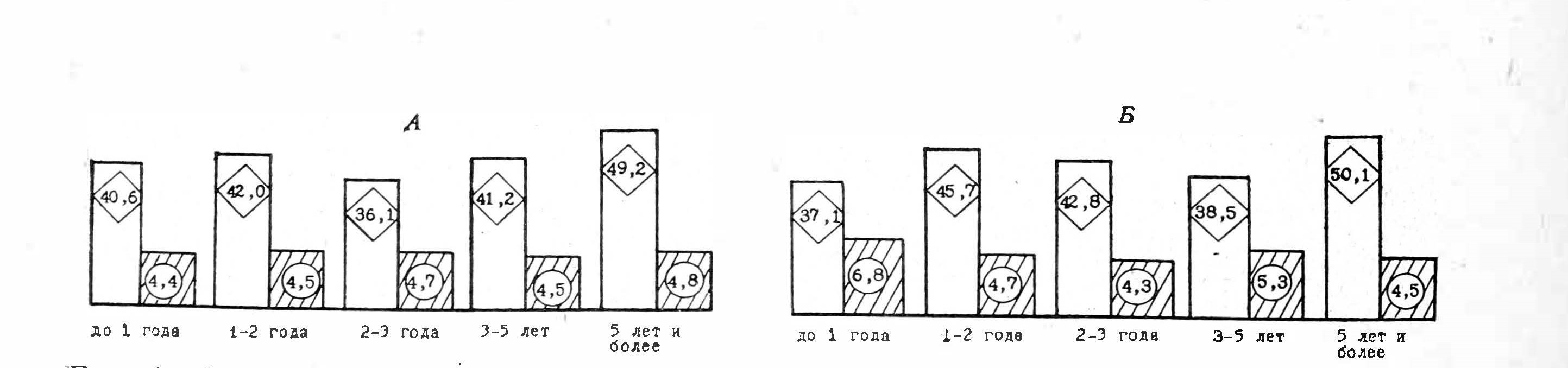 Своеобразные особенности фагоцитарной реакции лейкоцитов наблюдались с увеличением срока работы женщин в условиях профессиональной вредности (рис. 1, A и Б).