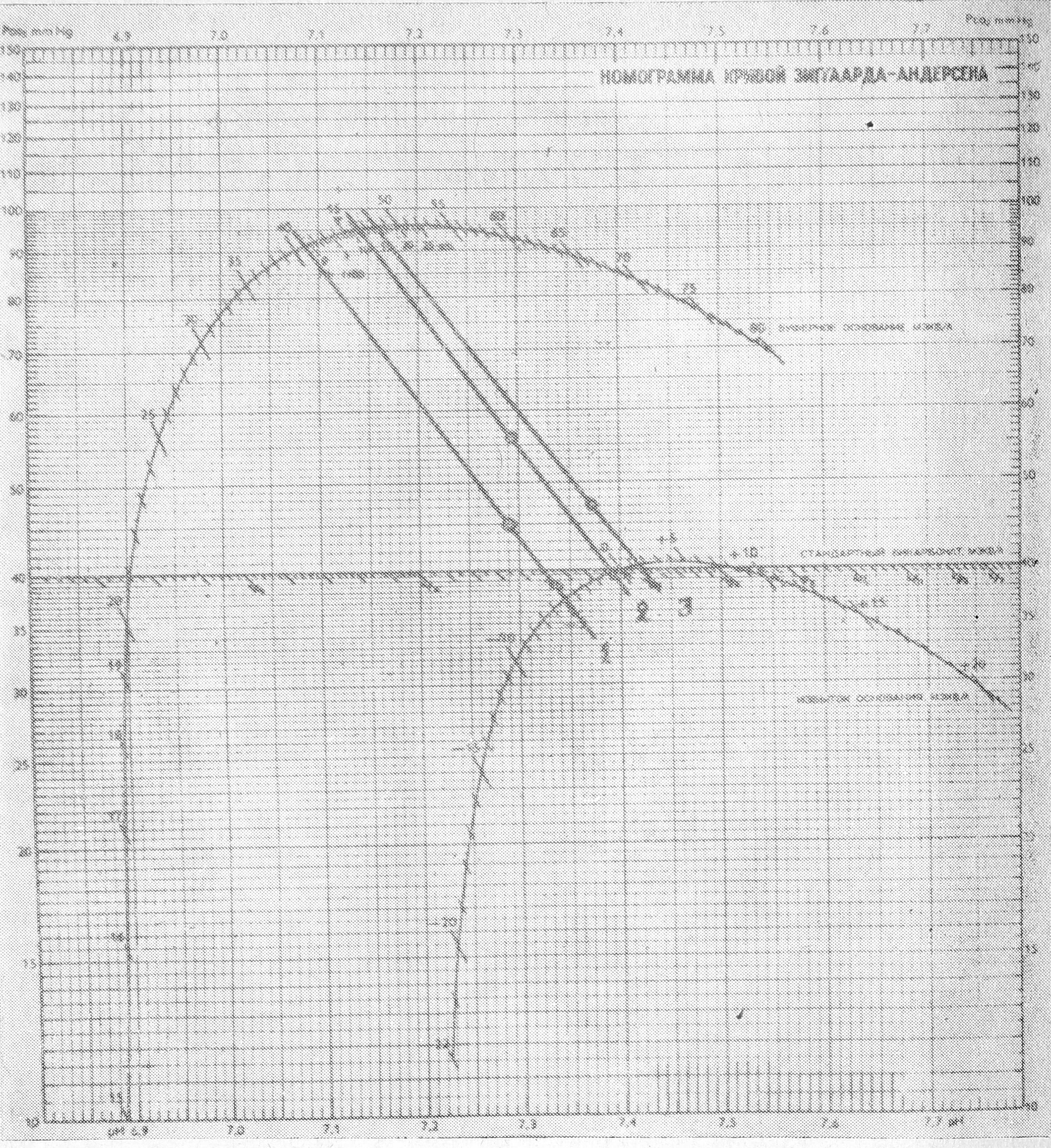 На нашем материале (63 больных) получены различные варианты сдвигов кислотно-щелочного баланса у больных атеросклерозом. На рис. 2 приведены «буферные линии» трех больных (1 — больной С., компенсированный метаболический ацидоз; 2 — больной Г., компенсированный дыхательный ацидоз; 3 — больной Н., смешанный алкалоз). У 42 больных констатирован ацидоз (66,7%), у 21—алкалоз (33,3%). Метаболические изменения были у 31 пациента (49,2%), дыхательные — У 16 и смешанные — также у 16 (по 25,4%). Ацидоз преобладал у больных со II и III ст. атеросклероза.