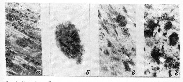 1. К., 42 лет, больна ревматизмом с 1953 г., митральный стеноз. В сердечной мышце этой больной под микроскопом обнаруживаются необычайно крупные гранулы с высокой фосфатазной активностью, главным образом по полюсам ядер, а также по ходу миофибриллей, в форме более или менее длинных цепочек (рис. 1, а). Такого большого количества необычайно крупных гранул с интенсивным отложением сульфата свинца в нормальной сердечной мышце никогда не обнаруживается. Аналогичные гра­нулы встречаются и в ганглиозных клетках предсердия. Здесь гранулы заполняют все клеточное тело и начальные участки дендритов; ядра же нервных клеток не содержат осадка свинца. По ходу нервных стволов лизосомы выявляются в клетках периневрия. Относительно высокая активность фермента отмечается в стенке кровеносных сосудов, в капиллярах. Поскольку срез миокарда после обработки в субстрате со свинцовой солью принимает коричневую окраску, а под микроскопом обнаруживается необычай­но большое количество лизосом в мышечных волокнах миокарда, необходимо поста­вить это в связь с наличием стеноза митрального клапана, с выраженным кальцинозом зоны митрального стеноза, с функциональной декомпенсацией сердца. Резкое увеличе­ние размера лизосом, преимущественное накопление их в сердечной мышце опреде­ляют, по-видимому, развитие и проявление хронической сердечной недостаточности, связанное с накоплением в лизосомах и фагосомах продуктов обмена, пигмента, с пре­вращением части лизосом в гранулы липофусцина. Таким образом, мельчайшие гра­нулы, набухшие пузырчатые формы гранул и зерна липофусцина являются, очевидно, лизосомами различного состава и функционального состояния. Необычно крупные ли­зосомы с высокой фосфатазной активностью в сердечной мышце у данной больной отражают, как нам кажется, нарушенный обмен, имеющий своим следствием накопле­ние продуктов обмена в различных типах гранул с фосфатазной активностью в лизо­сомах, фагосомах, гранулах липофусцина.