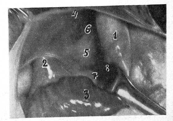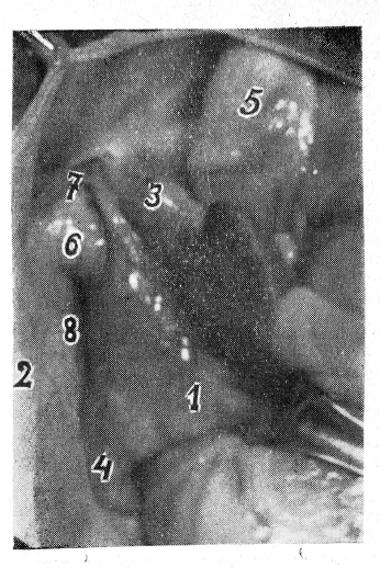 1 — правое предсердие; 2 — боковая стенка пе­рикарда; 3 —верхняя полая вена. 4 — ниж­няя полая вена; 5 — восходящая аорта; 6 — кон; тур правой верхней легочной вены; 7 — верхний перикардиальный карман; 8 — нижний перикардиальный карман.