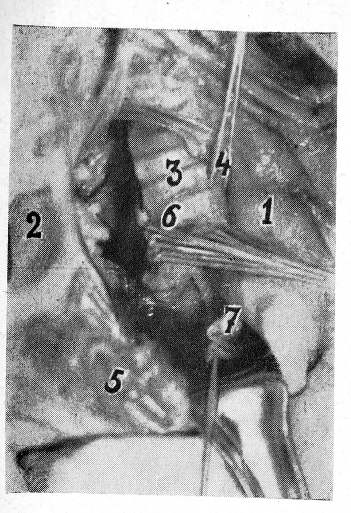 1 восходящая аорта; 2 — верхняя полая вена: 3 — трахея; 4 — подведена лигатура под левый главный бронх; 5 — правое предсердие с пра­вым ушком; 6 — ушивание пересеченного началь­ного отдела правого главного бронха; 7 — пере­сечен и перевязан центральный конец правой легочной артерии, периферическая часть также перевязана и ушла под верхнюю полую вену. Периферическая часть культи правого бронха об­работана и иссечена.