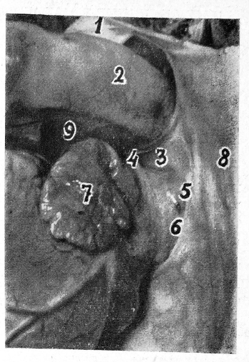 1 — конечный отдел восходящей аорты; 2 — ле­вая легочная артерия; 3 — верхний перикарди­альный карман; 4 — складка Маршалла; 5 — верхняя левая легочная вена; 6 — нижняя левая легочная вена; 7 — левое предсердие с левым ушком; 8 — левая боковая стенка перикарда; 9 — левый вход в поперечный синус.