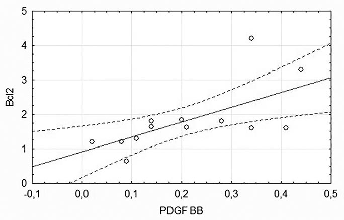 Рис. 2. Прямая корреляционная взаимосвязь между тромбоцитарным фактором роста ВВ (PDGF BB) и белком Bсl2 у пациентов с рестенозом зоны реконструкции