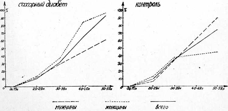 Рис. 1. Частота выявления коронарной недостаточности в контрольной группе и у больных сахарным диабетом в зависимости от пола и возраста (объяснение в тексте).
