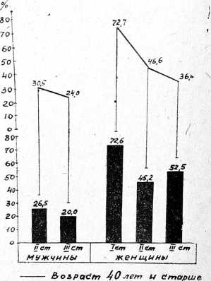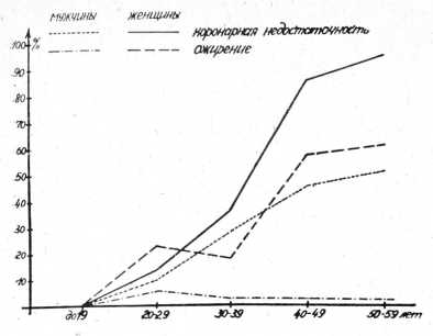 Мы провели анализ частоты обнаружения коронарной недостаточности у мужчин и женщин основной группы по возрастам и данные сравнили с показателями, установленными в контрольной группе (рис. 1).