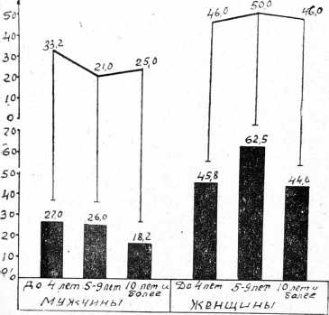 Рис. 3. Частота выявления коронарной недостаточности в зависимости от длительности заболевания сахарным диабетом с учетом возрастного состава (объяснение в тексте).