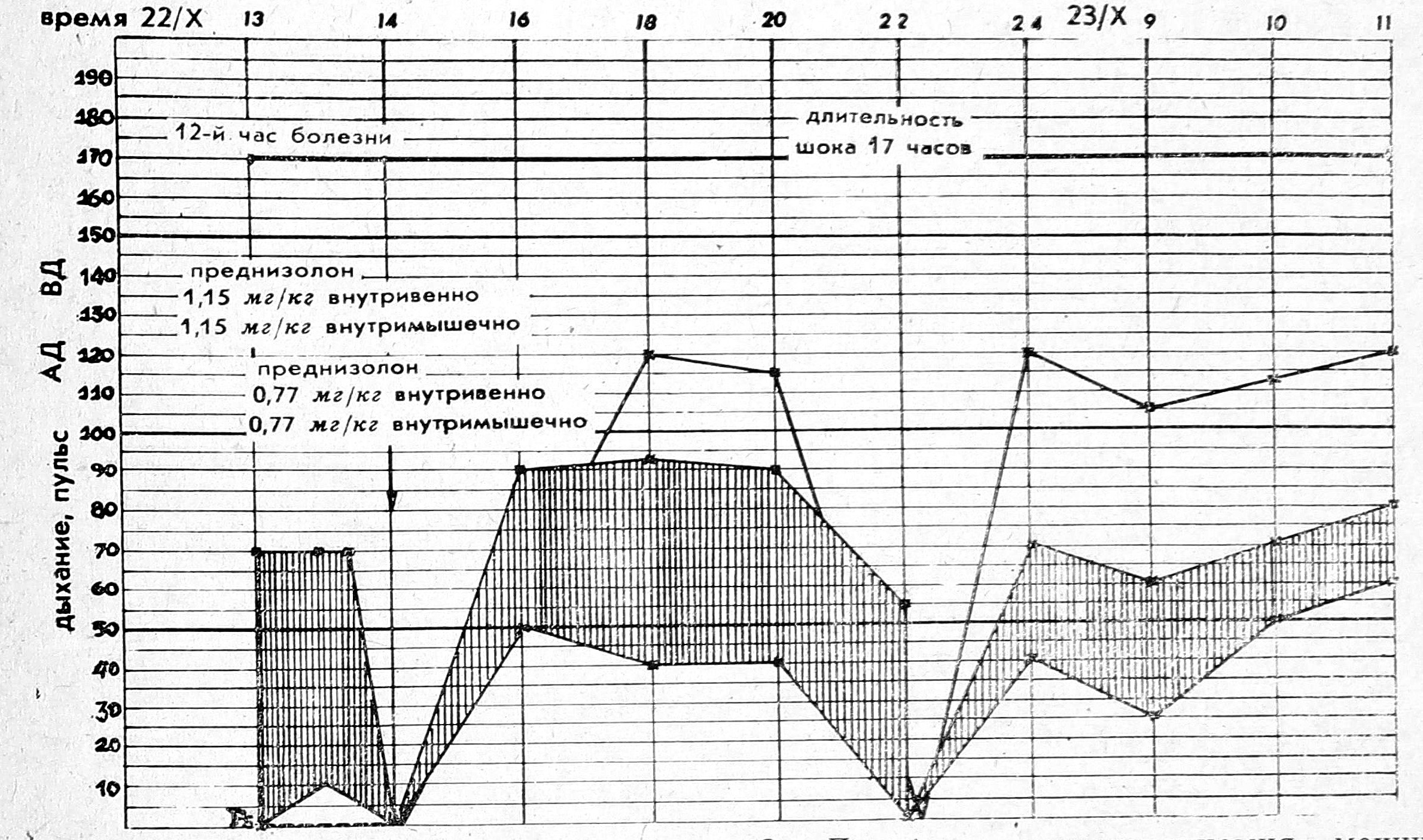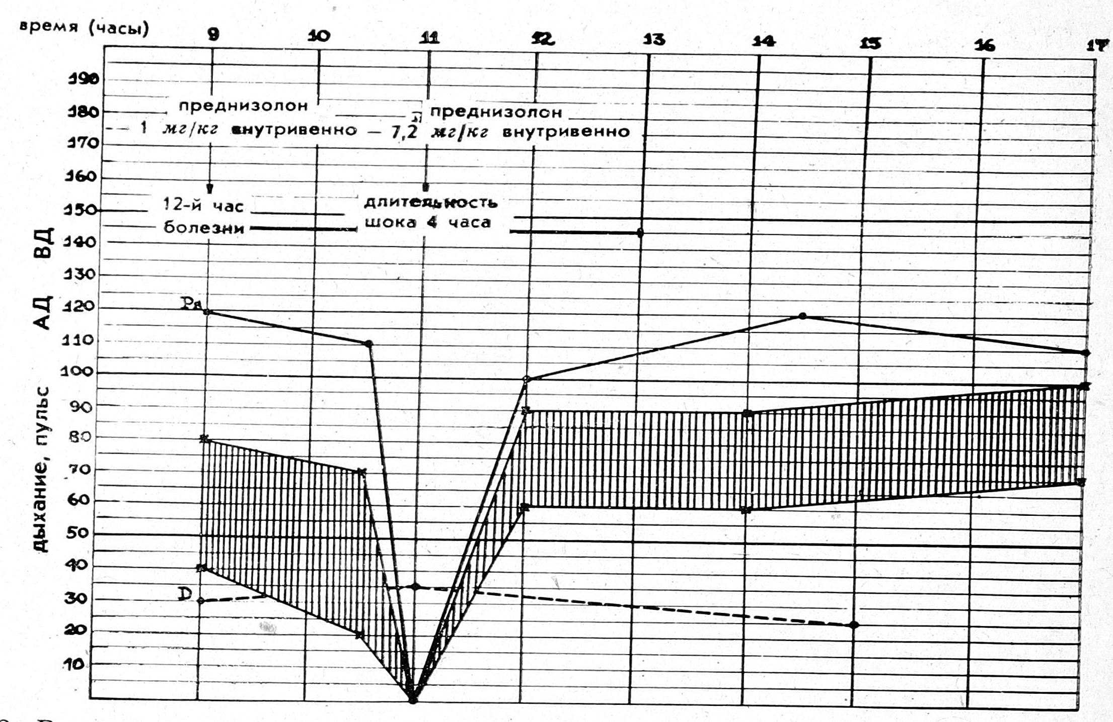 Результаты применения фармакологических доз глюкокортикостероидов у 11 больных с токсикоинфекционным шоком при менингококковой инфекции убедили нас в том, что у больных, поступивших в стационар в обратимую фазу шока, большие дозы преднизолона нормализуют нарушенное кровообращение гораздо быстрее и стабильнее, чем обычно применяемые дозы.