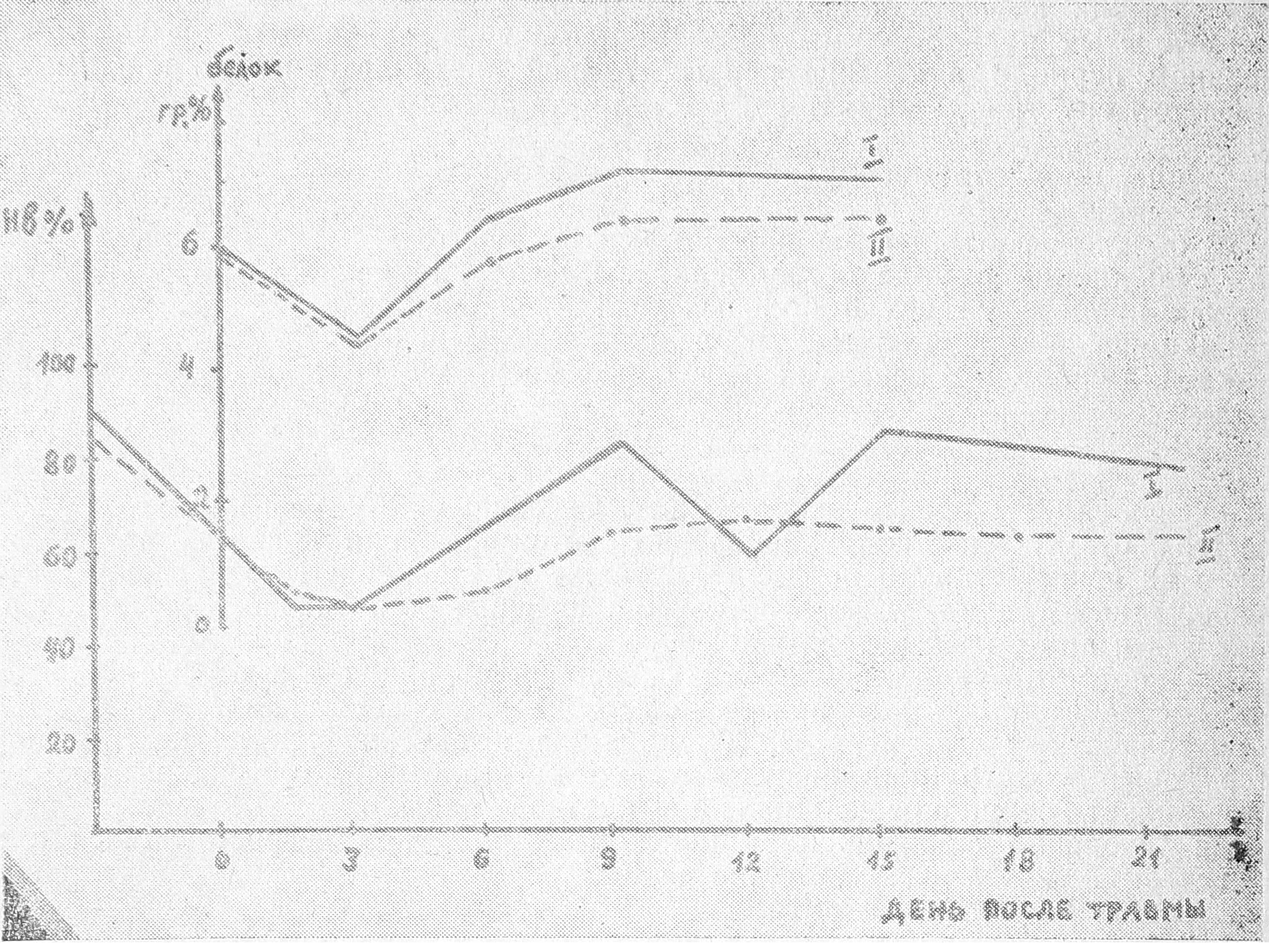 Рис. 1. Количество гемоглобина и сывороточного белка в зависимости от срока заболевания и метода гемотрансфузии.