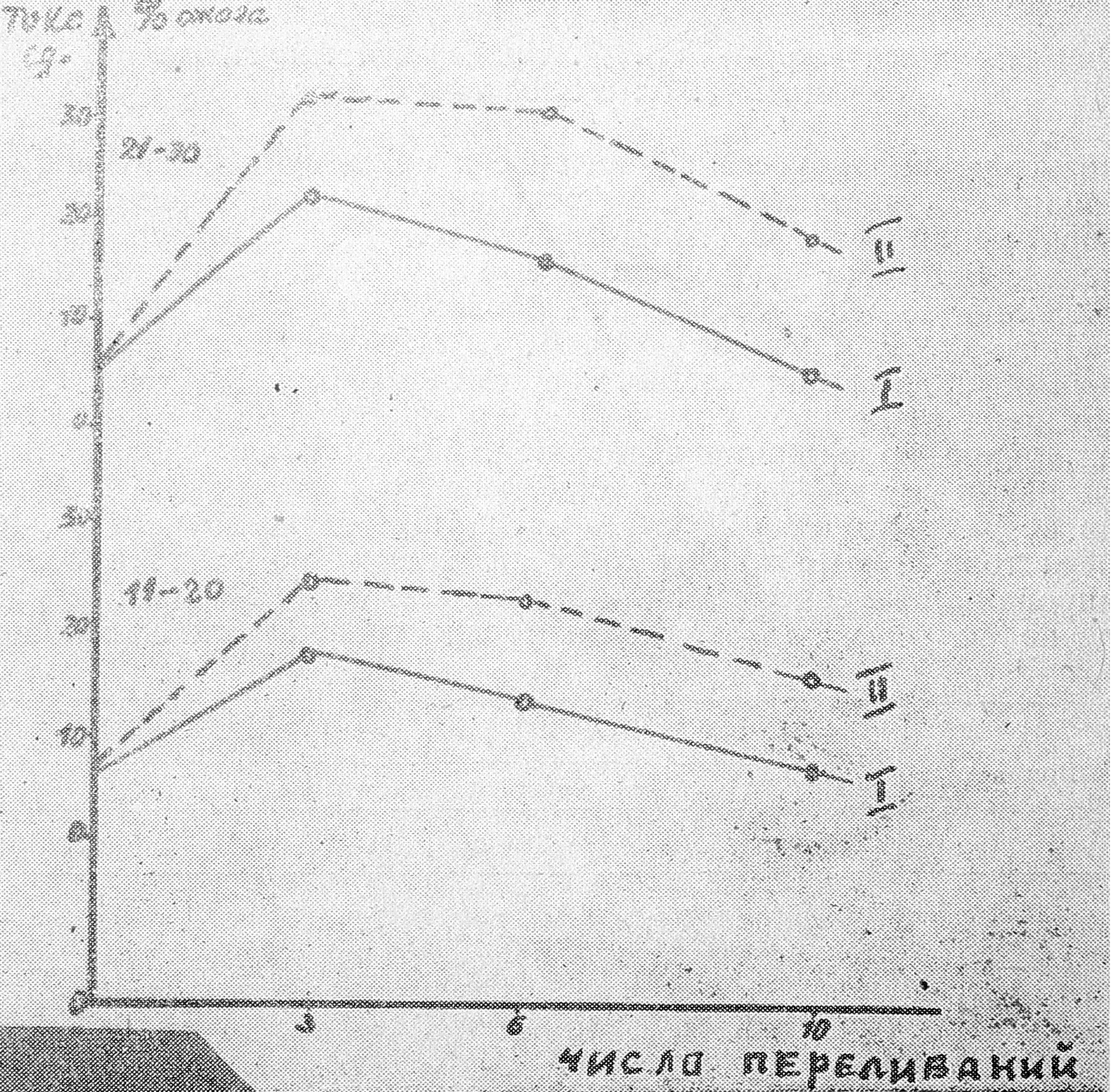 Прямые переливания крови обладают несомненно более выраженным дезинтоксирующим и стимулирующим действием. Они способствуют нормализации сна и аппетита, снижению диспепсических явлений и улучшению общего состояния. Более быстро восстанавливается количество эритроцитов и сывороточного белка (рис. 1), быстрее устраняется состояние анемии и гипопротеинемии.