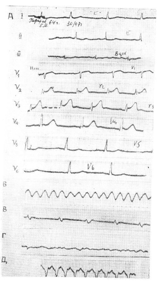 В 10 час. 05 мин. больной пожаловался на неприятные ощущения за грудиной, поташнивание. Дежурный врач отметил появление редких экстрасистол при частоте пульса 80, АД 130/90. Подкожно введен промедол с анальгином. В 10 час. 10 мин. внезапная остановка кровообращения: бледность кожи, пульс на лучевой и сонных артериях не пальпируется, тоны сердца не выслушиваются, дыхание редкое с последующей остановкой, зрачки широкие. Тотчас же начат закрытый массаж сердца (доц. М. К. Федорова), искусственное дыхание (асе. В. М. Андреев), внутрисердечно введен норадреналин (1 мл 0,01%). После этих мероприятий на ЭКГ зарегистрирована высоковольтная фибрилляция желудочков (рис. 1, Б). Фибрилляция успешно ликвидирована одиночным разрядом дефибриллятора (ИД-1-ВЭИ) в 4500 в (асс. И. П. Арлеевский). После ликвидации фибрилляции появился редкий идиовентрикулярный ритм. Продолжался массаж сердца (орд. А. А. Мингалеев) и искусственное дыхание. В последующем на протяжении 15 мин. 8 раз рецидивировала фибрилляция желудочков, которая каждый раз снималась одиночным разрядом дефибриллятора возрастающей силы тока (5—6—7 тыс. в). После устранения фибрилляции вновь появлялся редкий идиовентрикулярный ритм с полной асистолией сердца. Продолжался массаж и искусственное дыхание чистым кислородом. На 15-й минуте фибрилляция перешла в низкоамплитудную (рис. 1, В), что указывало на снижение активности сердца. В таких случаях электрическая дефибрилляция часто бывает неэффективной. Для стимуляции сердца в полость правого желудочка введена смесь, состоящая из 5 мл 10% хлористого кальция, 0,5 мл норадреналина, 2,5 мл новокаинамида, 0,3 мл атропина. Вслед за этим продолжили ЗМС и ИД. После этих процедур вновь возникла высоковольтная фибрилляция. Одиночным разрядом 7000 в фибрилляция ликвидирована, появилась желудочковая тахисистолия. Начал определяться слабый пульс вне массирующих движений, пациент слабо реагировал на боль. Желудочковая тахисистолия устранена разрядом дефибриллятора. На короткое время появился синусовый ритм и вновь — желудочковая тахисистолия, которая также была купирована разрядом 7000 в. На 20-й минуте от начала реанимации последняя дефибрилляция, ликвидировав желудочковую тахисистолию, вернула стойкий синусовый ритм с частотой 100 в 1 мин.