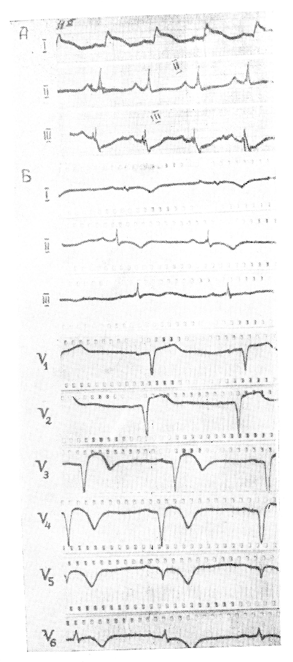 В 11 час. 45 мин. снята ЭКГ (рис. 2, А). Зарегистрирована монофазная кривая в I, Ѵ1—5отведениях.