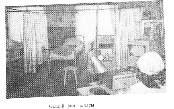 В этих целях в терапевтической клинике № 1 Казанского ГИДУ В а выделена палата площадью 42 ж2, в которой размещено 6 коек. Койки разделены задергивающимися занавесками из плотной ткани, прикрепленными к металлическим стойкам, что позволяет изолировать больных при проведении различных манипуляций, а также госпитализировать в палату лиц мужского и женского пола. У каждой койки стоит столик- каталка. В центре находится пост дежурной медсестры, подготовленный к работе дефибриллятор, электростимулятор. Имеются 2 шкафа для медикаментов, хирургического инструментария, лабораторного набора. На хирургическом столике — стерильные шприцы, система для капельных внутривенных вливаний, ампулы с медикаментами для экстренной помощи. Палата имеет централизованное снабжение кислородом с выводом к каждому больному.