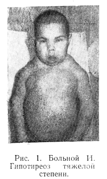 Ко 2-й гр. (вторая степень гипотиреоза, среднетяжелая) отнесены 10 больных с выраженными симптомами болезни, появившимися к концу 1-го, началу 2-го года жизни, со значительным отставанием в психомоторном и физическом развитии; к 3-й (третья степень, тяжелая) — 17 больных, родившихся с резко выраженными признаками болезни, причем у некоторых эти признаки были выявлены уже на 1-м году жизни, отмечалась крайняя задержка роста и интеллекта (см. рис. 1). 13 больным 3-й гр.., диагноз был поставлен, когда им было больше 3 лет, лечения они не получали; умственная отсталость у них граничит с идиотней.