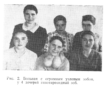 С каждой беременностью зоб у матери увеличивался в размере, и к настоящему времени у нее эутиреоидное состояние (СБИ — 7,0, БЭЙ — 4,5 мкг%). У 4 дочерей выявлен узловой зоб, гипотиреоз тяжелой степени (СБИ колеблется от 1,0 до 2,0, БЭЙ—от 0,9 до 1,7 мкг %, холестерин крови — от 183 до 320 мг%). Самая старшая дочь, кроме того, глухонемая. Лишь последняя дочь, 16 лет, в эутиреоидном состоянии, смогла окончить 8 классов.