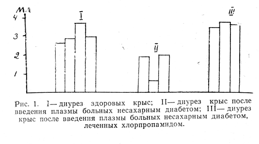 С целью изучения действия хлорпропамида при несахарном диабете были поставлены эксперименты на 48 беспородных белых крысах, заключающиеся в вырабатывании инсипидарного синдрома и изучении влияния на него хлорпропамида и питуитрина. Критерием оценки антидиуретической функции гипофиза был характер диуреза крыс в ответ на умеренную водную нагрузку. Жестким металлическим зондом животным вводили в желудок дистиллированную воду по 5 мл на 100 г, каждую крысу помещали в воронку, под которую ставили мерную пробирку. Количество мочи регистрировали каждый день в течение 4 часов. Для сопоставления диуреза животных делали пересчет количества выделенной каждой крысой мочи на 100 г веса.