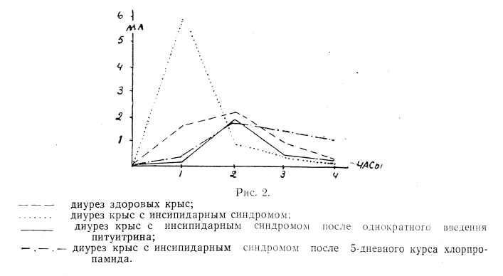 Рис. 2 демонстрирует четкий эффект однократного введения питуитрина. Точечная линия показывает, что у нелеченных крыс с несахарным диабетом дефицит антидиуретического гормона приводит к выделению почти всей жидкости в течение 1-го часа. Введение питуитрина почти полностью тормозит диурез в 1-й час. По своему характеру кривая диуреза после введения питуитрина приближается к кривой у нормальных крыс, максимум выделяется в течение 2-го часа.