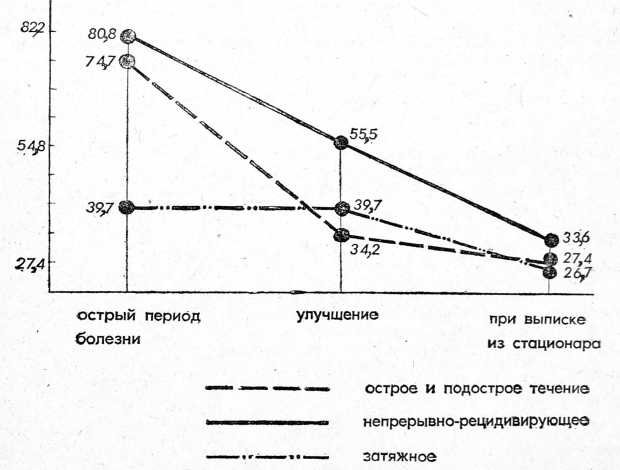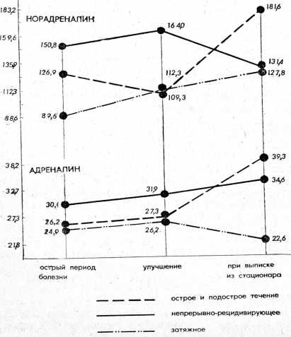 Таким образом, при всех вариантах течения болезни наблюдалось своеобразие нейро-гуморальных показателей, что отражало в какой-то мере адаптивные способности организма. Если при остром и подостром вариантах вначале отмечалась тенденция к угнетению функции симпато-адреналовой системы и преобладанию парасимпатической, то в процессе лечения происходило постепенное их выравнивание.