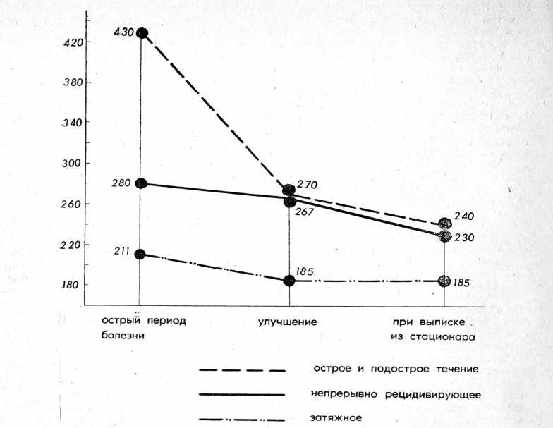 Содержание серотонина у больных с затяжным течением было равно в среднем 211±18 мкг/л при норме 179±23, по показатели варьировали, что было особенно заметно в динамике болезни. Так, если при поступлении определенной связи между тяжестью кардита и количеством серотонина установить не удалось, то клиническое улучшение в этих случаях сопровождалось нарастанием серотонина.