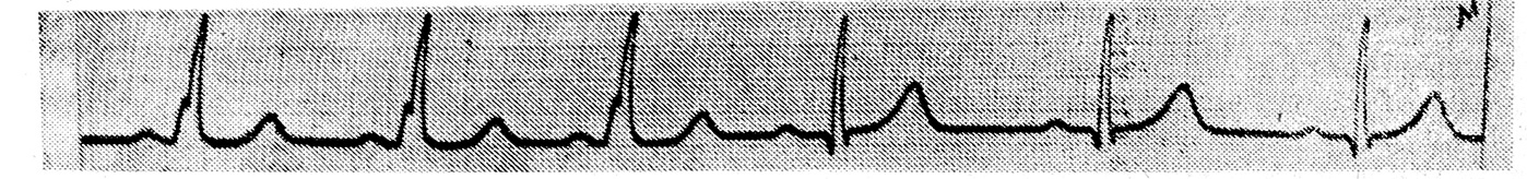 М., 4,5 лет (рис. 2). На ЭКГ регистрируется преходящий синдром WPW. Во II отведении 1, 2, 3-й комплексы типичны для синдрома WPW, при котором длительность PQ равна 0,06 с, выражена дельта-волна и продолжительность QRS равна 0,12 с. Последующие 4, 5, 6-е комплексы синусовые, где импульс от предсердий к желудочкам следует обычным путем. Длительность PQ равна 0,12 с, продолжительность QRS — 0,06 с; в 4, 5, 6-х комплексах дельта-волна отсутствует^.