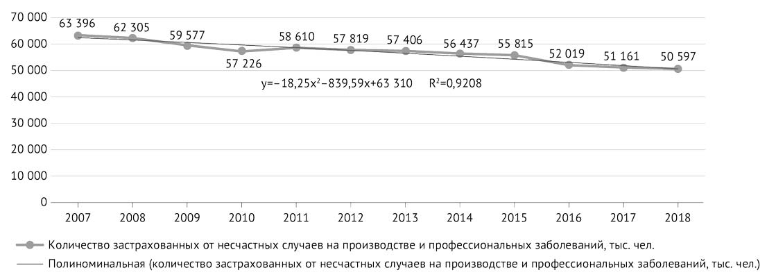 Рис. 1. Численность застрахованных от несчастных случаев на производстве и профессиональных заболеваний в 2007–2018 гг.