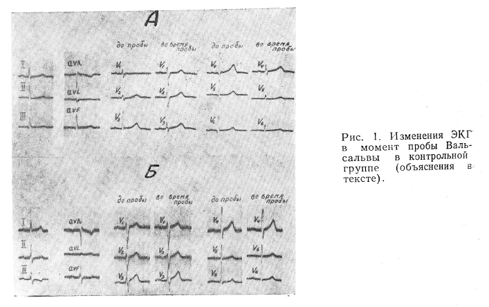 Ряд зарубежных авторов [16 и др.] рекомендует для этой цели использовать пробы Вальсальвы — патуживание. Авторы показали, что у больных коронарной недостаточностью, кардиосклерозом во время пробы Вальсальвы ЭКГ существенно не изменяется. У людей с ЭКГ-изменениями конечной части желудочкового комплекса, обусловленными нарушениями регуляции со стороны вегетативной нервной системы, в момент этой пробы происходит значительное улучшение или полная нормализация ЭКГ. Механизм воздействия пробы Вальсальвы на сердце заключается прежде всего в том, что в результате повышения внутригрудного давления, уменьшения притока крови к сердцу и опущения диафрагмы происходит изменение положения сердца в грудной клетке. Кроме того, вследствие снижения ударного объема сердца наступает рефлекторное раздражение симпатической нервной системы, что вызывает учащение ритма сердечной деятельности. Учитывая сказанное, а также то, что у лиц, занимающихся физической культурой и спортом, определяются вегетативные сдвиги, в частности повышение тонуса блуждающего нерва, мы поставили себе задачу с помощью этой пробы изучить влияние изменения функции вегетативной нервной системы на конечную часть желудочкового комплекса ЭКГ при перенапряжении сердца.