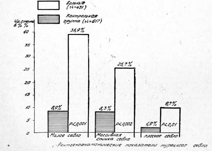 Рис. 1. Диаграмма сравнительного распределения некоторых признаков строения турецкого седла среди больных шизофренией и психически здоровых