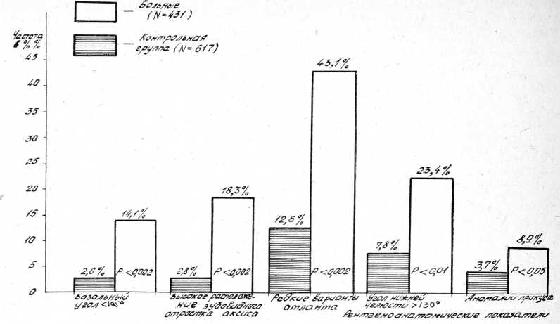Наличие какой-либо аномалии или редкого варианта строения черепа или атланта может еще не иметь определенного клинического значения. Однако обнаружение нескольких крайних вариантов или аномалий у одного и того же лица позволяет вынести более конкретное суждение о сомато-биологическом статусе больного, то есть выводы становятся более вероятными. Совокупность четырех и более крайних и редких признаков у одного и того же больного выявлялась в 61,9+2,3%, тогда как в контрольной группе она не обнаруживалась ни разу.