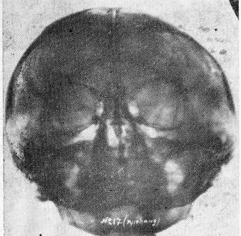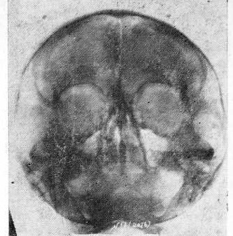Рис. 3. Фотокопия рентгенограммы черепа в подбородочно-носовой проекции больной Б., 24 лет (диагноз — злокачественная шизофрения, состояние дефекта). На снимке определяется метопический шов, кости свода истончены.