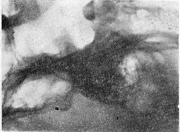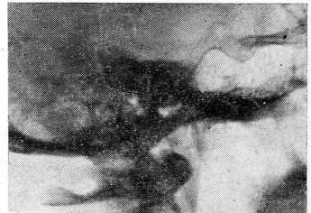 Рис. 5. Контактная копия фрагмента боковой рентгенограммы черепа больной М., 20 лет (диагноз — злокачественная шизофрения, параноидная форма). На снимке определяется окостенение межклиновидных связок турецкого седла и отверстие в задней дужке атланта.