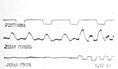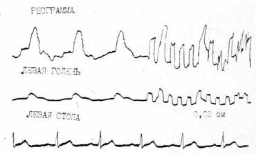 Данные реографии (рис. 1): реографический индекс на голени снижен, на стопе равен 0. На реограмме голени нет дополнительных зубцов, снижены анакрота и катакрота. После обследования был поставлен клинический диагноз: облитерирующий эндартериит 2—3-й степени. 11/X 1976 г. под местной анестезией выполнена операция — парартериальная симпатэктомия передней большеберцовой, задней большеберцовой артерий в нижней трети и тыльной артерии стопы. Послеоперационный период протекал без осложнений. Боли в левой голени уменьшились, исчезло чувство онемения. Кожная температура между 1 и 2-м пальцами повысилась на 1°, на тыле стопы — на 1,1°, на голени — на 1,2°. На реограмме стопы и голени (рис. 2) значительно увеличился реографический индекс, появились дополни тельные зубцы, что свидетельствует об улучшении периферического кровоснабжения конечности. Ч. выписан на 19-й день в удовлетворительном состоянии.