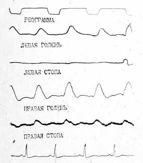 - А., 44 лет, поступил 9/IX 1976 г. с жалобами на боли в левой голени и стопе при ходьбе, перемежающуюся хромоту через 50 м пути, чувство онемения и зябкости в левой стопе и пальцах. Указанные неприятные ощущения появились несколько лет назад. С апреля 1976 г. А. дважды лежал в стационарах, улучшения не было. Органы брюшной и грудной полости без отклонений от нормы.