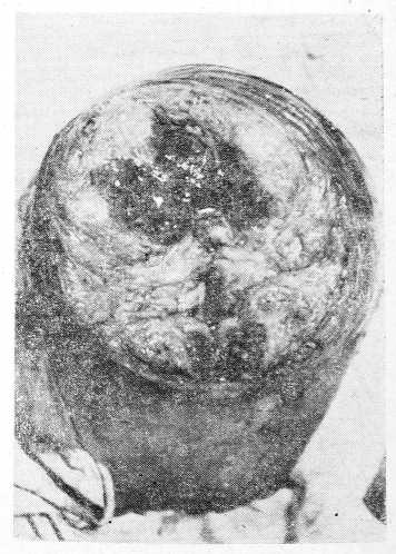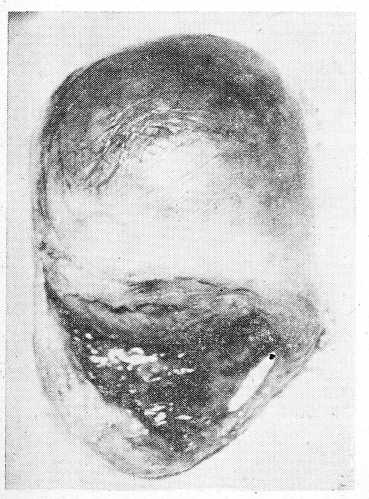 Ввиду подозрения на некроз узла произведена операция корпорального кесарева сечения с последующей суправагинальной ампутацией матки без придатков. Извлечен живой ребенок массой тела 2750 г, длиной 46 см, с признаками гипотрофии. Послед прикреплялся в правом углу матки. После удаления плода и последа полость матки с трудом вмещала мужской кулак и располагалась под узлом. Все тело матки занимал огромный субсерозно-интерстициально-субмукозно расположенный фиброма- тозный узел, нижний полюс которого виднелся в верхней части полости матки (см.рис.1)