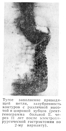 При 2-м варианте бариевая взвесь попадает из пищевода в приводящую петлю, расположенную антиперистальтически. В ней контрастная взвесь в ранние сроки после операции задерживалась в течение 40—60 мин., а в более поздние сроки (спустя 10—12 месяцев) —до 1,5—2,5 часов. С первых же дней после операции были видны антиперистальтические маятникообразные перемешивания контрастной массы в приводящей петле от пищевода к брауновскому анастомозу и в обратном направлении. Проходимость купола обнаружена у 8 больных, у 4 наблюдалось поступление контрастной массы в двенадцатиперстную кишку. На отдаленных сроках приводящая петля при тугом заполнении, напоминает резецированный желудок, определяется зазубренность контуров с различной высотой и шириной зубцов (см. рис.).