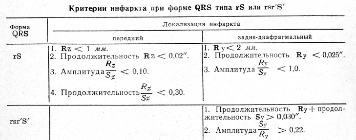 Мы считали необходимым опираться в анализе быстрой фазы не только на патологический зубец Q и его отношения к зубцу R, но и на всю форму комплекса QRS в виде rS или rsr'S' (см. табл.).