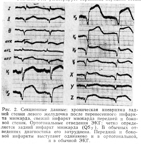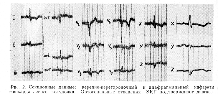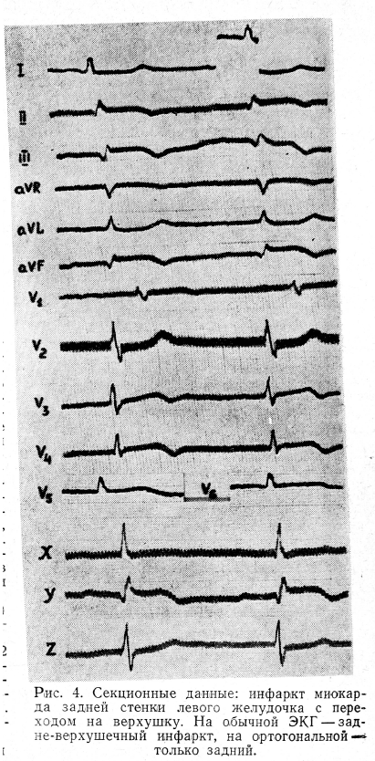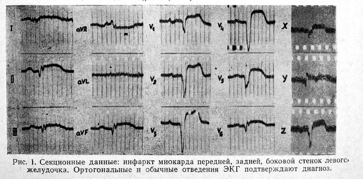 Сравнение данных ЭКГ и результатов аутопсии (29 случаев) показало, что ортогональные отведения при передне-задних инфарктах позволили распознать обе локализации в 2 случаях, где задняя не отразилась в общепринятых 12 отведениях. В 1 случае задне-верхушечного поражения ортогональная ЭКГ не отразила верхушечной локализации. В 4 случаях переднего инфаркта левого желудочка по ортогональным отведениям (результирующий вектор!) была затруднена оценка распространенности его на зону верхушки.
