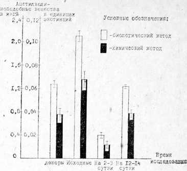 Полученные данные свидетельствуют, что в клинической практике можно применять оба метода определения АХПВ. Химический метод достоверно отражает те же изменения в содержании ацетилхолиноподобных веществ в крови, что и биологический. Дополнительное исследование истинной и ложной холинэстераз существенно углубляет представление о холинергических процессах, происходящих в организме.