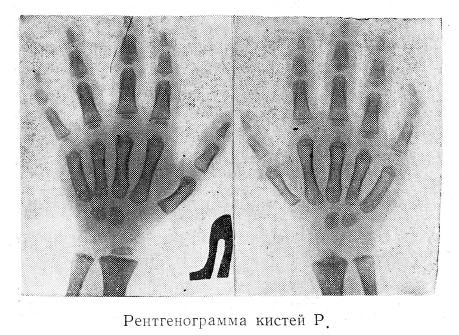 Гем — 7 г%, Э. 2 130 000, ц. п.— 0,9, Л. 5000, тромбоцитов 141 000, э.— 1%, п.— 2%, с.— 35%, л.— 56%, м.— 6%; ретикулоцитов — 0,9%, РОЭ 35 мм/час. Анизоцитоз, пойкилоцитоз, время свертывания крови 5 мин., длительность кровотечения 1,5 мин. Костный мозг беден клеточными элементами, других патологических изменений в нем не наблюдается. Снижено содержание общего белка. Гипергаммаглобулинемия (30%). На рентгенограмме обеих кистей отсутствуют ядра окостенения трехгранных костей, появление которых характерно для этого возраста. Обращает на себя внимание неравномерное появление ядер окостенения пястных костей и фаланг на левой и правой кистях. Левый первый палец имеет ядро окостенения ногтевой фаланги, справа оно отсутствует. Длина и диаметр пястной кости и фаланг первых пальцев левой и правой руки различны. Особенностью наблюдения является раннее выявление данного заболевания.